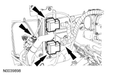 28. Connect the engine wiring harness-to-PCM electrical connectors and the wiring harness electrical connector. Attach the wiring harness retainer.