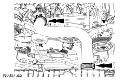 15. Position the Evaporative Emission (EVAP) hose and connect it to the EVAP canister purge valve. Connect the EVAP canister purge valve electrical connector.