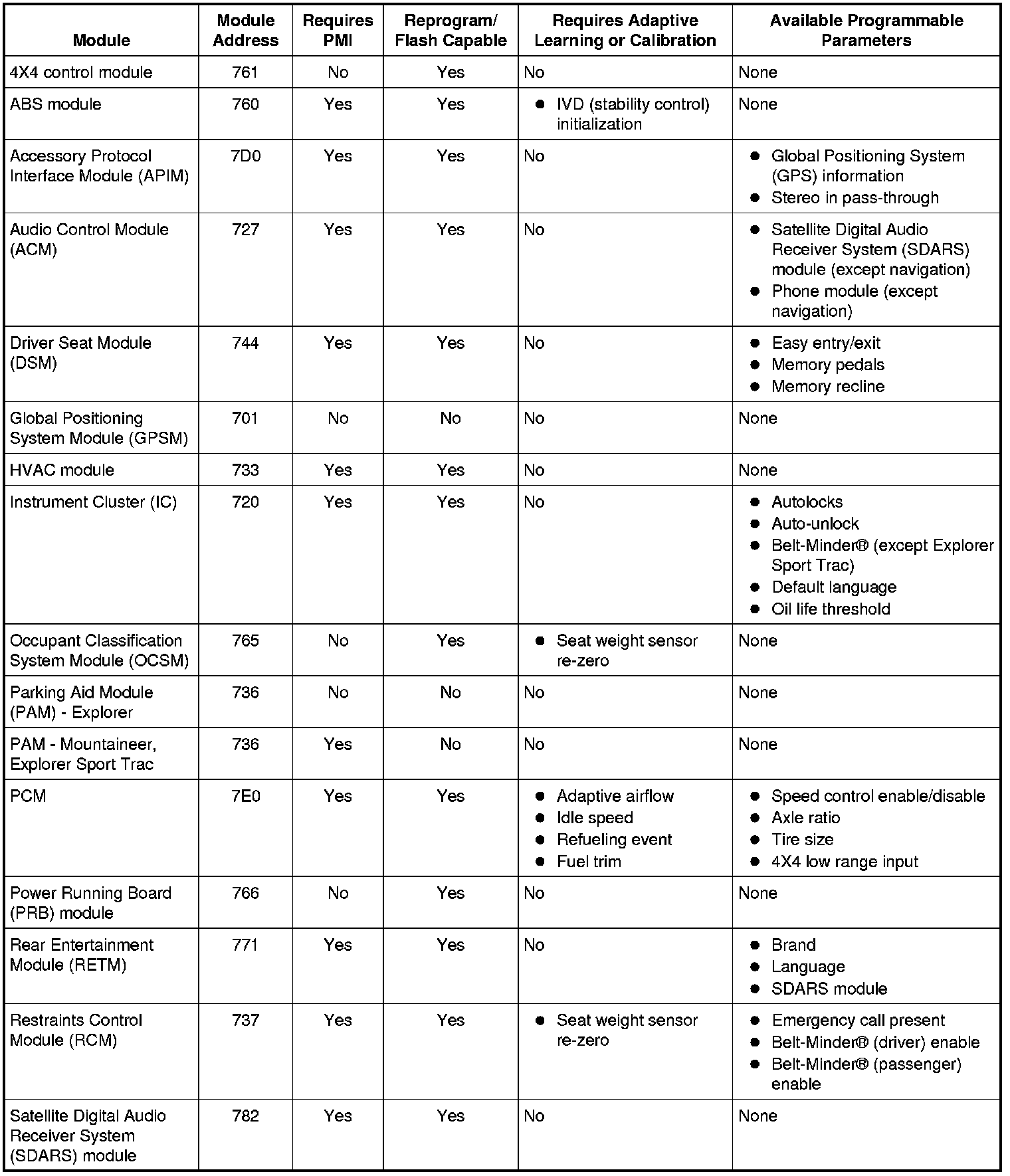 PMI is a scan tool process which configures settings in a new module. Data used for the PMI process is automatically downloaded from the original module and stored when a scan tool session is started. If this data cannot be retrieved from the module being replaced, the scan tool may prompt for As-Built data entry or display a list of parameter values that need to be manually selected. Some modules are reprogrammed during PMI when a strategy/calibration update is available. To carry out PMI, refer to Programmable Module Installation (PMI) Programmable Module Installation (PMI).