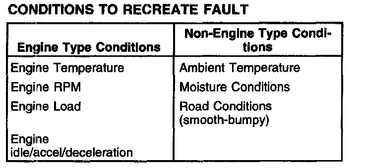 Recreating the concern is the first step in isolating the cause of the intermittent symptom. A thorough investigation should start with the customer information worksheet located. If freeze frame data is available, it may help in recreating the conditions at the time of a malfunction indicator lamp diagnostic trouble code (MIL DTC). Listed below are some of the conditions for recreating the concern: