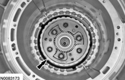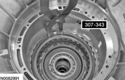 Using the Retaining Ring Pliers 307-343, install the center support snap ring. Using a suitable tool, be sure the snap ring is fully seated.
