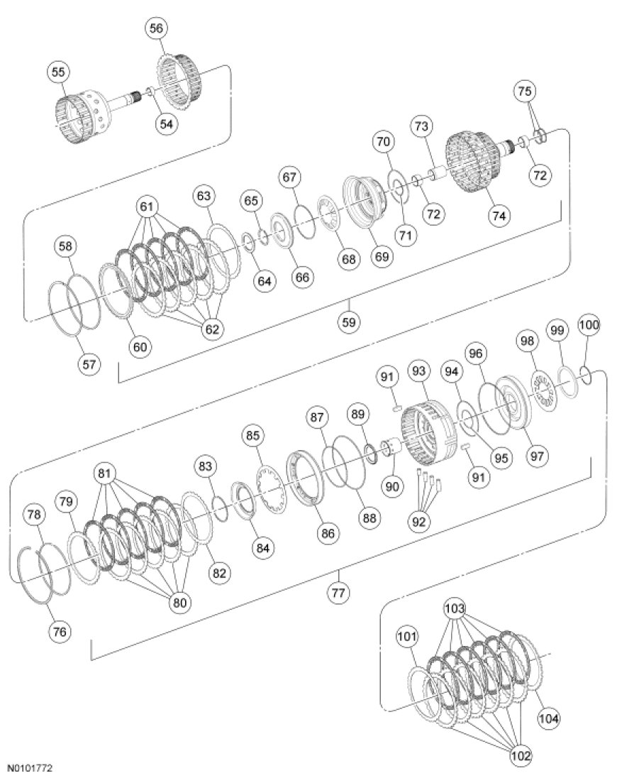 36. Install the low/reverse clutch plates, starting with the pressure plate and alternating between the friction and steel plates and ending with the wave spring plate on the top.