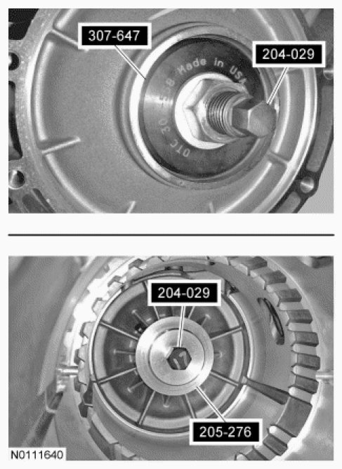 12. Using the Needle Bearing Installer 307-647, the Drawbar 204-029 and the Front Wheel Hub Oil Seal Installer 205-276, install the bearing in the transmission case.
