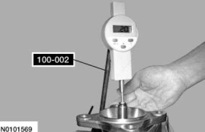 41. Using the Dial Indicator Gauge with Holding Fixture 100-002, lift up on the output shaft flange and record the reading. The reading should be within 0.15-0.35 mm (0.005-0.013 in).