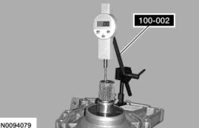 43. Install the Dial Indicator Gauge with Holding Fixture 100-002 on the transmission case and position the plunger on the output shaft.
