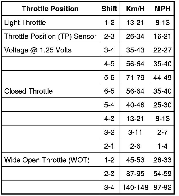 NOTE: Shift speed ranges are approximate for all applications. For specific applications (engine, axle ratio, tire size and application), refer to the Automatic Transmission Specification booklet. Always drive the vehicle in a safe manner according to driving conditions and obey all traffic laws.