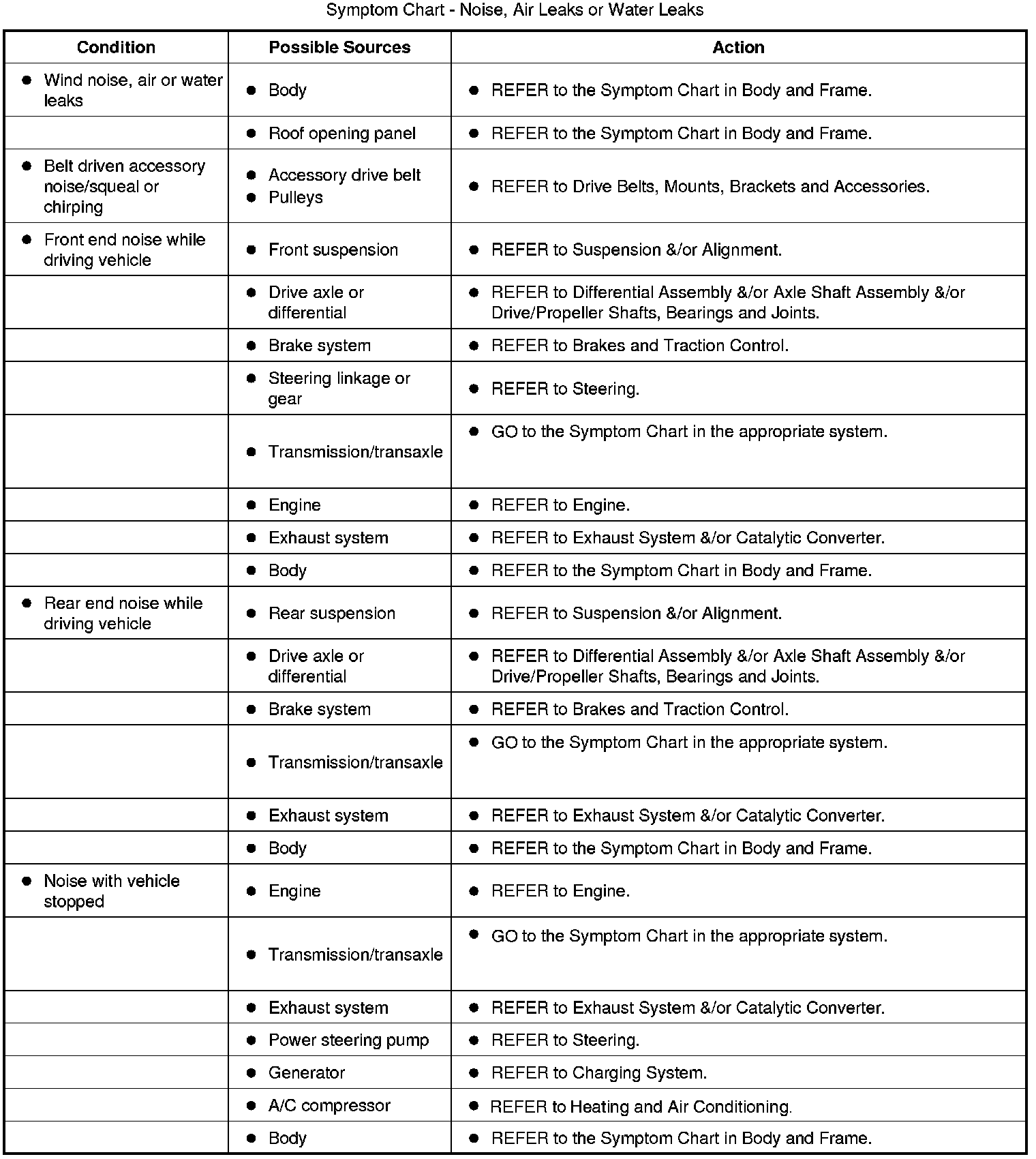 Symptom Chart - Noise, Air Leaks or Water Leaks