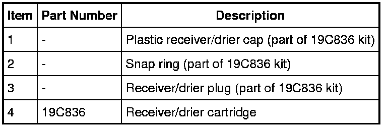 NOTE: Installation of a new receiver/drier desiccant cartridge is not required when repairing the A/C system, except when there is physical evidence of contamination from a failed A/C compressor or damage to the receiver/drier desiccant cartridge. Damage to the receiver/drier desiccant cartridge includes physical damage to the receiver/drier desiccant cartridge or moisture contamination. Moisture contamination results only from a complete loss of refrigerant and equalization of the refrigerant system pressure with atmospheric pressure for a period longer than one hour. If even a slight amount of positive refrigerant pressure is present in the system before repairs are carried out, the receiver/drier desiccant cartridge should not be replaced.