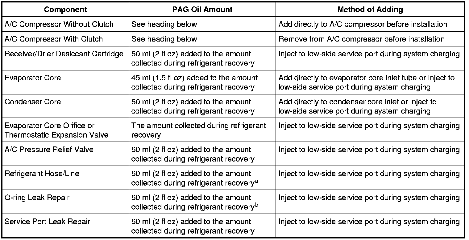 b The amount specified may be used for one or multiple O-ring leak repairs. Do not multiply the refrigerant oil amount by the number of O-ring leaks being repaired.