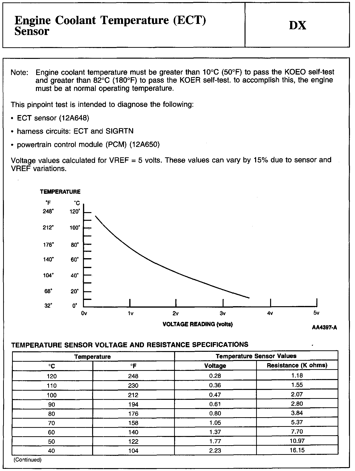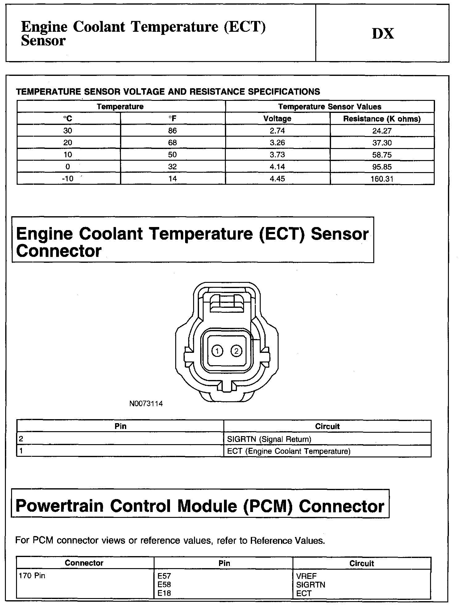 PINPOINT TEST DX: ENGINE COOLANT TEMPERATURE (ECT) SENSORNote, Temperature Sensor Voltage And Resistance Specifications: