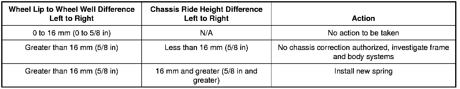 14. Using the recorded wheel well difference numbers, the recorded chassis ride height difference numbers and the following repair action chart, determine what repair action is needed to correct the vehicle lean condition.