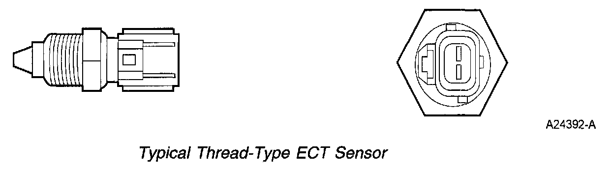The ECT measures the temperature of the engine coolant. The PCM uses the ECT input for fuel control and for cooling fan control. There are 3 types of ECT sensors; threaded, push-in, and twist-lock. The ECT sensor is located in an engine coolant passage.