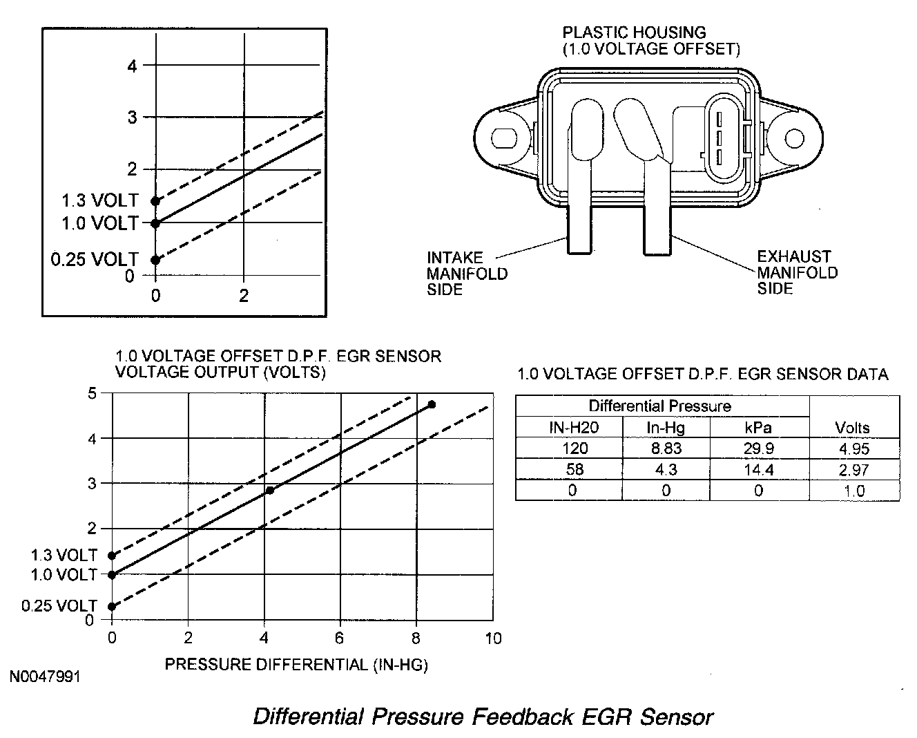 The differential pressure feedback EGR sensor is a ceramic, capacitive-type pressure transducer that monitors the differential pressure across a metering orifice located in the orifice tube assembly. The differential pressure feedback EGR sensor receives this signal through 2 hoses referred to as the downstream pressure hose (REF SIGNAL) and upstream pressure hose (HI SIGNAL). The HI and REF hose connections are marked on the differential pressure feedback EGR sensor housing for identification (note the HI signal uses a larger diameter hose). The differential pressure feedback EGR sensor outputs a voltage proportional to the pressure drop across the metering orifice and supplies it to the PCM as EGR flow rate feedback.