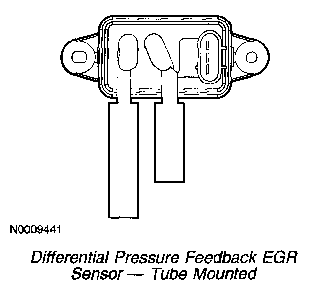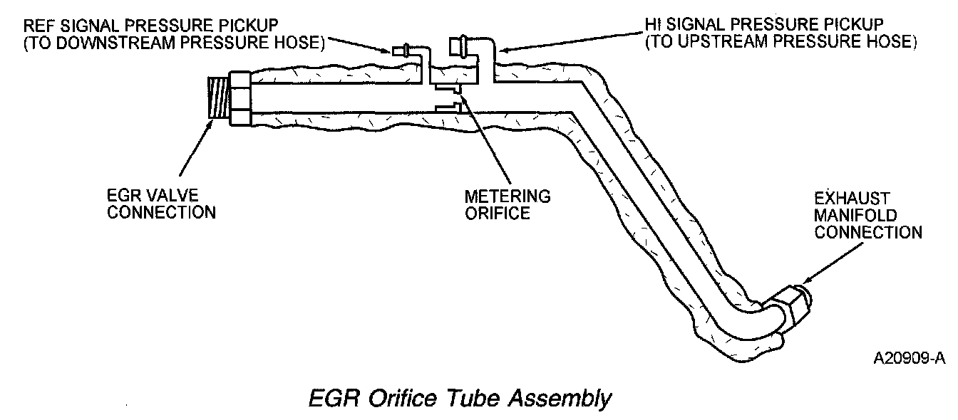The EGR orifice tube assembly is a section of tubing connecting the exhaust system to the intake manifold. The assembly provides the flow path for the EGR to the intake manifold and also contains the metering orifice and 2 pressure pick-up tubes. The internal metering orifice creates a measurable pressure drop across it as the EGR valve opens and closes. This pressure differential across the orifice is picked up by the differential pressure feedback EGR sensor which provides feedback to the PCM.
