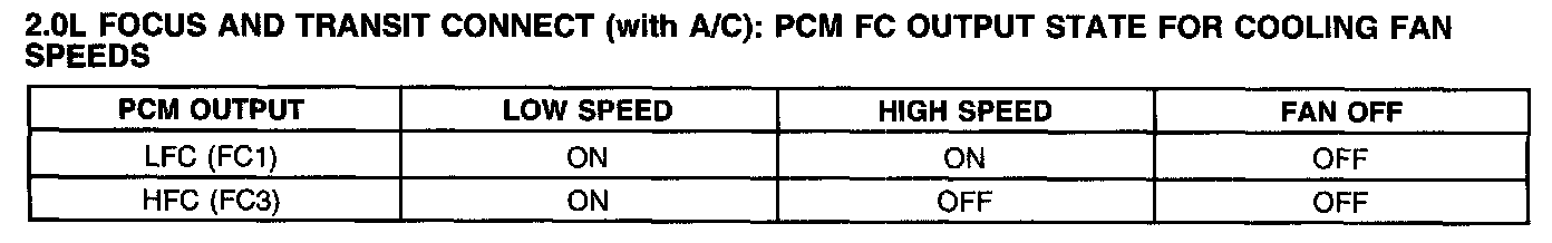 2.0L Focus And Transit Connect (With A/C): PCM FC Output State For Cooling Fan Speeds: