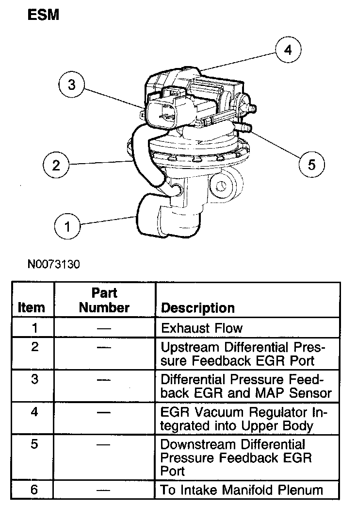 The ESM is an integrated differential pressure feedback EGR system that functions in the same manner as a conventional differential pressure feedback EGR system. The various system components have been integrated into a single component called the ESM. The flange of the valve portion of the ESM bolts directly to the intake manifold with a metal gasket that forms the metering orifice. This arrangement increases system reliability, response time, and system precision. By relocating the EGR orifice from the exhaust to the intake side of the EGR valve, the downstream pressure signal measures manifold absolute pressure (MAP). This MAP signal is used for EGR correction and inferred barometric pressure (BARO) at ignition on. The system provides the PCM with a differential pressure feedback EGR signal that is identical to a traditional differential pressure feedback EGR system.