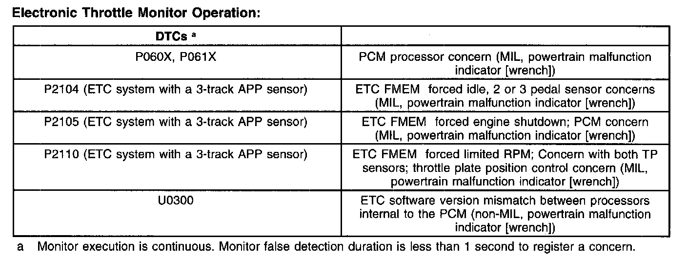 The ETC monitor system is distributed across 2 processors within the PCM: the main powertrain control processor unit (CPU) and a separate monitoring processor. The primary monitoring function is carried out by the independent plausibility checker (IPC) software, which resides on the main processor. It is responsible for determining the driver-demanded torque and comparing it to an estimate of the actual torque delivered. If the generated torque exceeds driver demand by a specified amount, appropriate corrective action is taken.