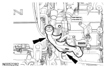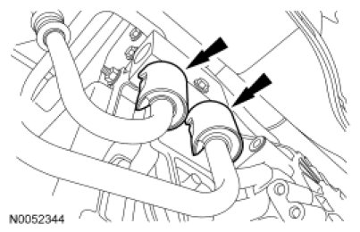 23. Route the coolant hoses to the correct position on the transaxle filler tube.