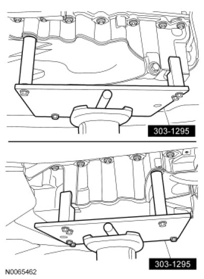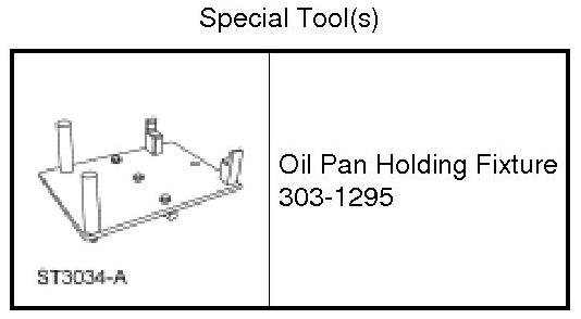 6. NOTICE: The Oil Pan Holding Fixture must be carefully aligned to the mounting bosses on the oil pan. Failure to follow these instructions may result in damage to the oil pan.