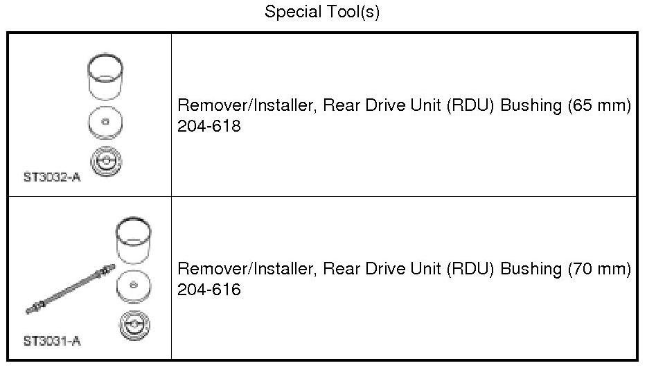 1. NOTE: Make sure the alignment marks on the Rear Drive Unit (RDU) Bushing (70 mm) Remover/Installer 204-616/2 are aligned with the anti-rotation tabs on the RDU bushing.