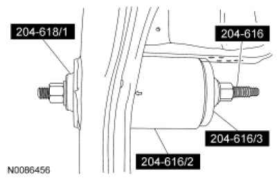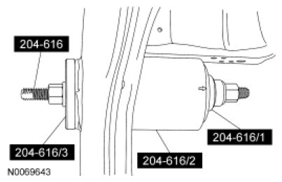 NOTE: When installing the RDU bushing, Rear Drive Unit (RDU) Bushing (70 mm) Remover/Installer 204-616/2 will fall away as the RDU bushing is installed into the subframe. The Rear Drive Unit (RDU) Bushing (70 mm) Remover/Installer does not control the depth of the bushing. The RDU bushing is fully seated when the Rear Drive Unit (RDU) Bushing (70 mm) Remover/Installer 204-616/3 and Rear Drive Unit (RDU) Bushing (70 mm) Remover/Installer 204-616/1 fall away from the subframe, do not continue to tighten the Rear Drive Unit (RDU) Bushing (70 mm) Remover/Installer.