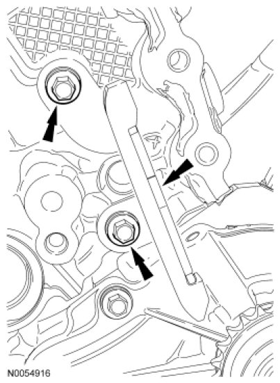 53. Install the RH secondary timing chain tensioner and the 2 bolts.