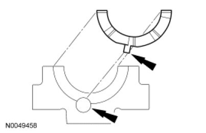 Install the lower crankshaft thrust washer to the back side of the No. 4 rear main bearing cap, with the tab aligned with the cutout in the main bearing cap.