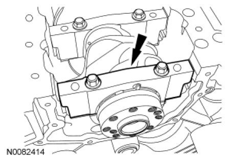 - Apply a 5.5 mm (0.21 in) bead of Motorcraft(R) High Performance Engine RTV Silicone to the 2 crankshaft seal retainer plate-to-cylinder block joint areas on the sealing surface of the oil pan.