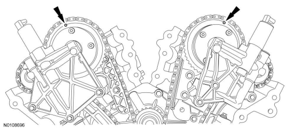 14. Install the primary timing chain with the colored links aligned with the timing marks on the VCT assemblies and the crankshaft sprocket.