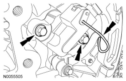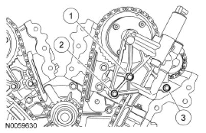 15. NOTE: The VCT bolt and the exhaust camshaft bolt must be discarded and new ones installed. However, the exhaust camshaft washer is reusable.