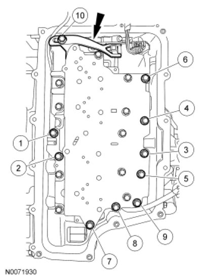 5. Install the TR sensor detent spring and the 10 bolts. Tighten the valve body bolts in the sequence shown.