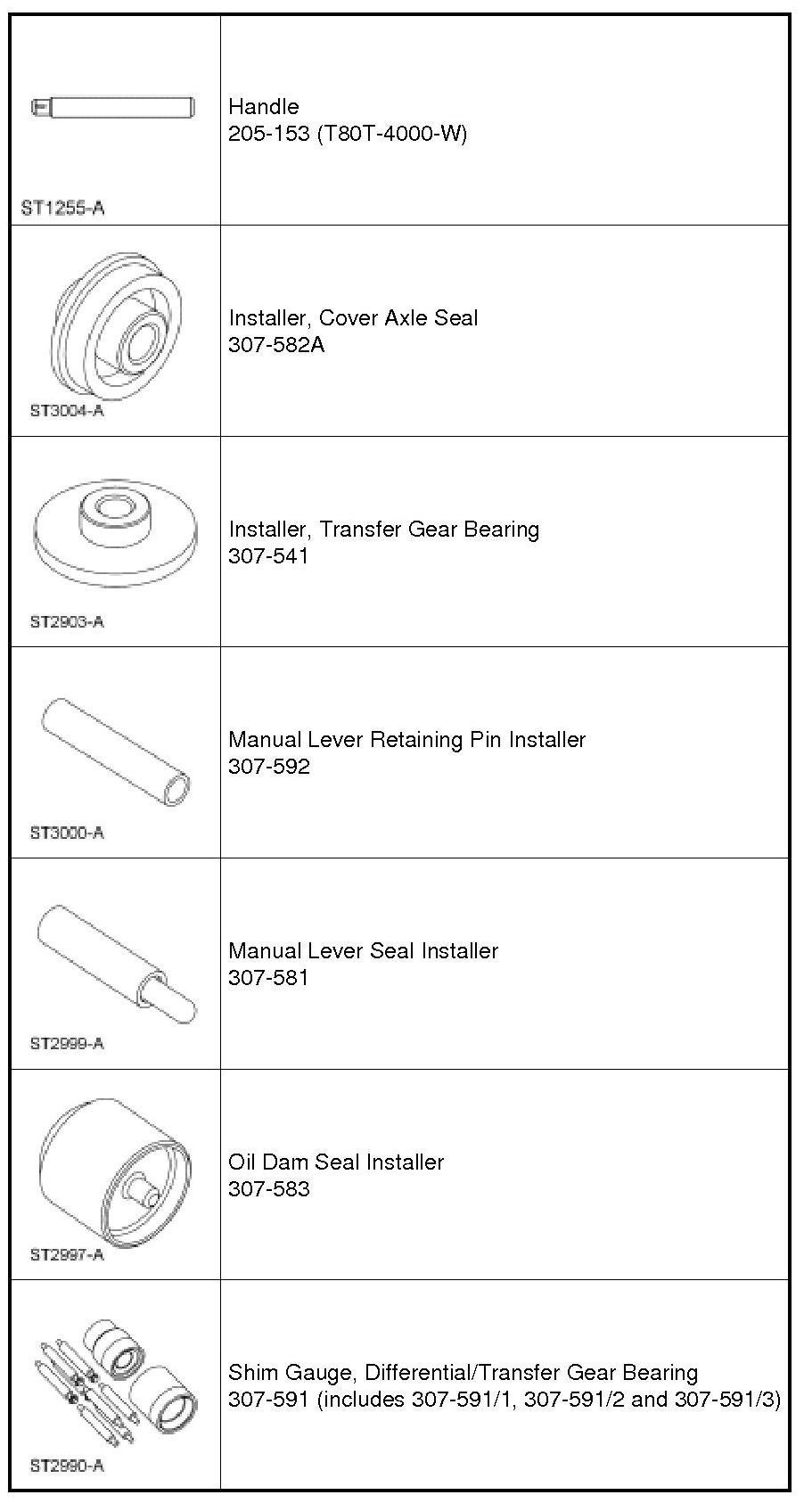 25. NOTE: Make sure that the silicone has been cleaned off the machined surface of the transaxle case and the torque converter housing before installing the Differential/Transfer Gear Bearing Shim Gauge 307-591/3 (4 spacers) or the preload measurement may be inaccurate.