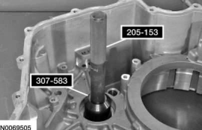 2. Using the Handle 205-153 and the Oil Dam Seal Installer 307-583, install the transfer shaft fluid dam in the transaxle case.