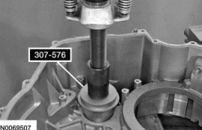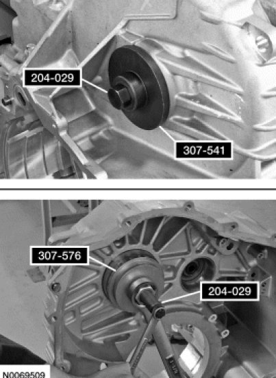 6. Using the Bearing Cup Installer 307-576, Transfer Gear Bearing Installer 307-541 and Drawbar 204-029, press the differential bearing cup in the transaxle case.