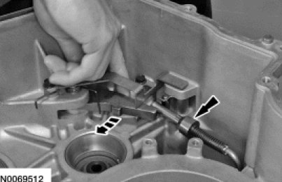 24. Install the Differential/Transfer Gear Bearing Shim Gauge 307-591/3 (studs) in the transaxle case to align the torque converter housing.