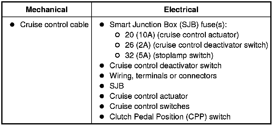 NOTE: If any concerns are noted with the speedometer, stoplamps or horn, address those concerns by referring to the appropriate systems before continuing cruise control diagnosis.