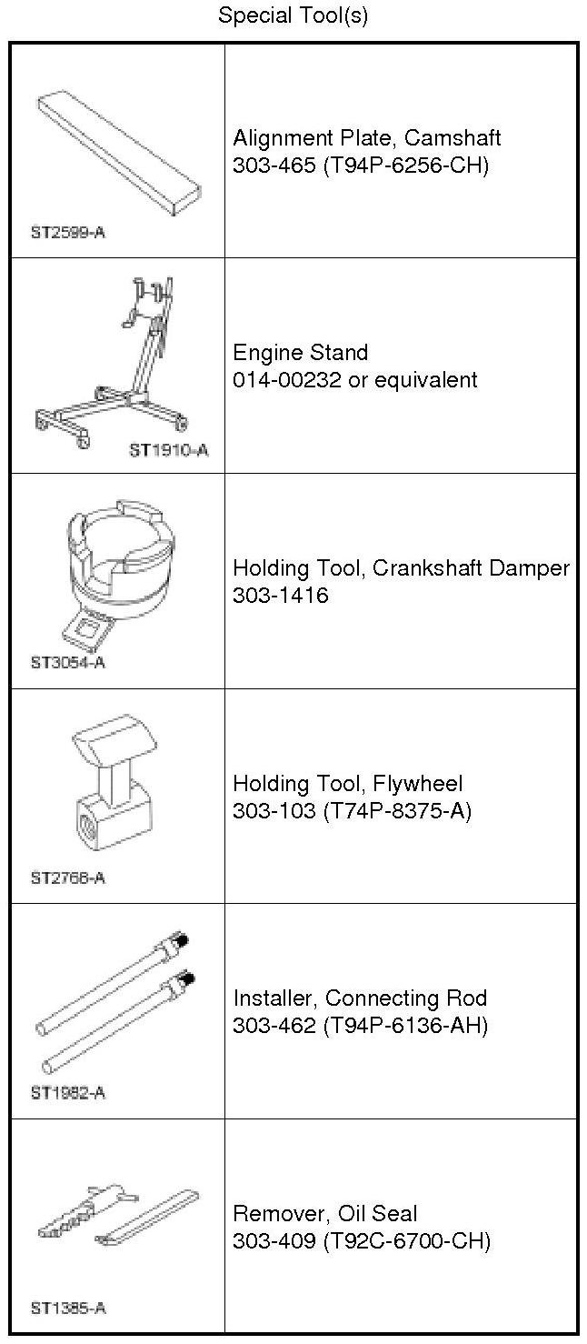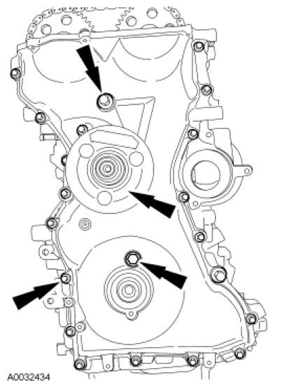 NOTICE: Do not loosen or remove the crankshaft pulley bolt without first installing the special tools as instructed in this procedure. The crankshaft pulley and the crankshaft timing sprocket are not keyed to the crankshaft. The crankshaft, the crankshaft sprocket and the pulley are fitted together by friction, using diamond washers between the flange faces on each part. For that reason, the crankshaft sprocket is also unfastened if the pulley bolt is loosened. Before any repair requiring loosening or removal of the crankshaft pulley bolt, the crankshaft and camshafts must be locked in place by the special tools, otherwise severe engine damage may occur.