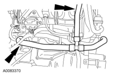 10. Disconnect the coolant hose assembly from the thermostat housing and the PCV fitting on the intake manifold.