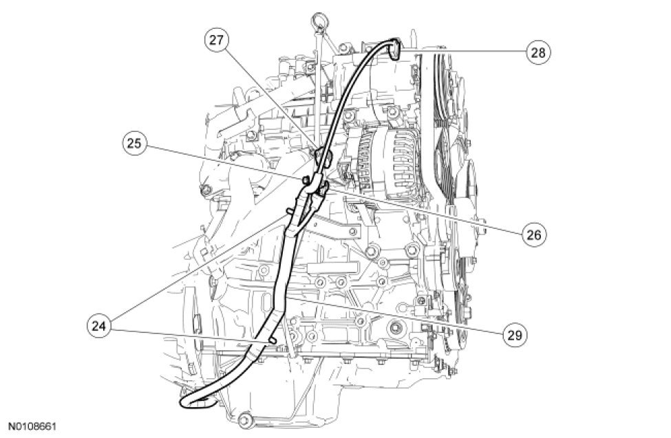 17. Remove the 2 battery cable locators from the engine oil level indicator tube bracket.