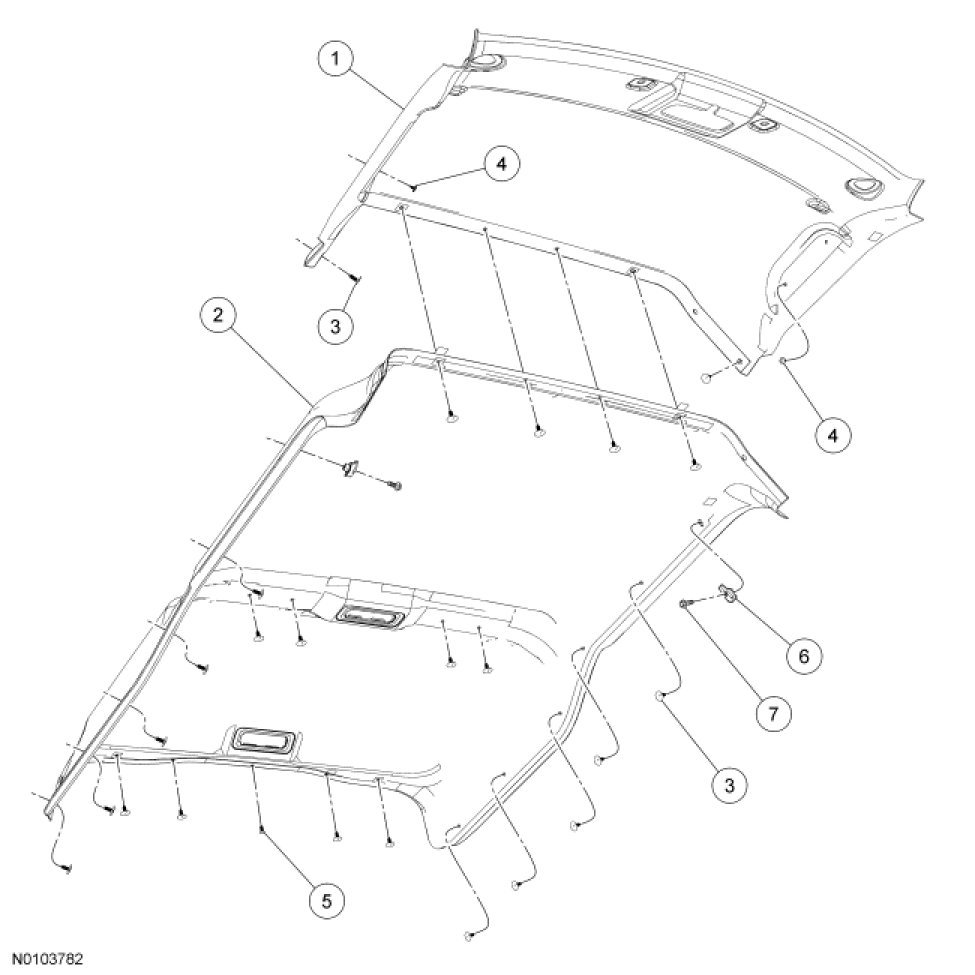 1. Remove the front overhead console. For additional information, refer to Instrument Cluster / Carrier &/or Interior Moulding / Trim.