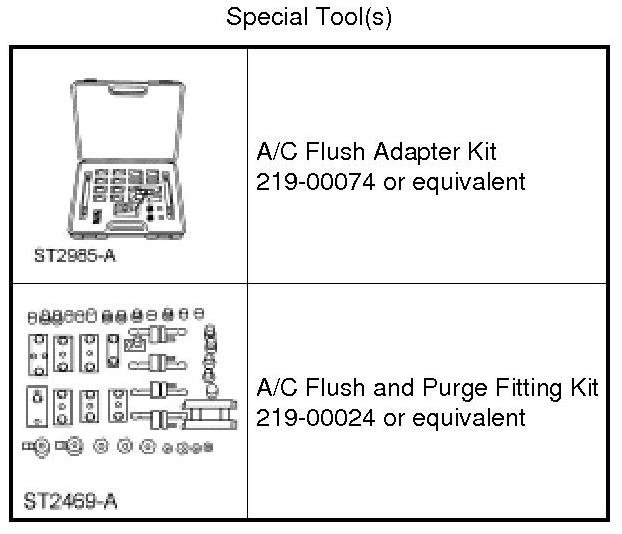 NOTICE: On vehicles being serviced for an internal compressor or desiccant failure, a new suction accumulator or receiver/drier, Thermostatic Expansion Valve (TXV) or evaporator core orifice and any hoses containing mufflers must be installed prior to filtering the Air Conditioning (A/C) system. Internal plumbing of these devices makes it impossible to correctly remove any foreign material. These components are typically discarded after A/C system contamination. Hoses without mufflers can normally be reused unless they are clogged with foreign material. The filter is intended for use on one vehicle only.