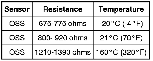 - For the OSS sensor, measure the resistance between OSS connector pin 1, component side and OSS connector pin 2, component side. Record the resistance. Resistance should be as follows below: