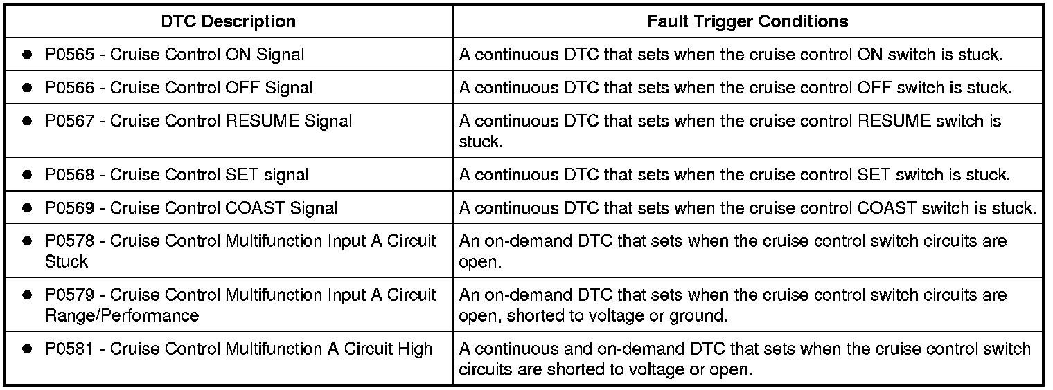 A reference voltage is sent from the PCM to the steering wheel cruise control switches. When a switch is pressed, the voltage is routed through a specific resistor value for each function. The PCM provides the ground for the reference voltage to determine which control input function has been selected. When the brake pedal is applied, the PCM deactivates the cruise control, if engaged.
