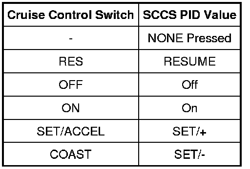 - Press each cruise control switch button while monitoring the cruise control switch PID (SCCS).