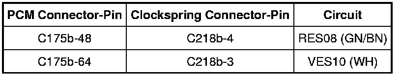 - Measure the resistance between the C218b-3, circuit VES10 (WH), harness side and the clockspring C218b-4, circuit RES08 (GN/BN), harness side and ground.