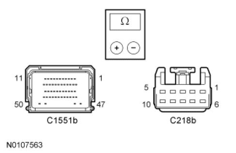 - Measure the resistance between the upper clockspring pin 1, component side and the clockspring C218b pin 3, component side.