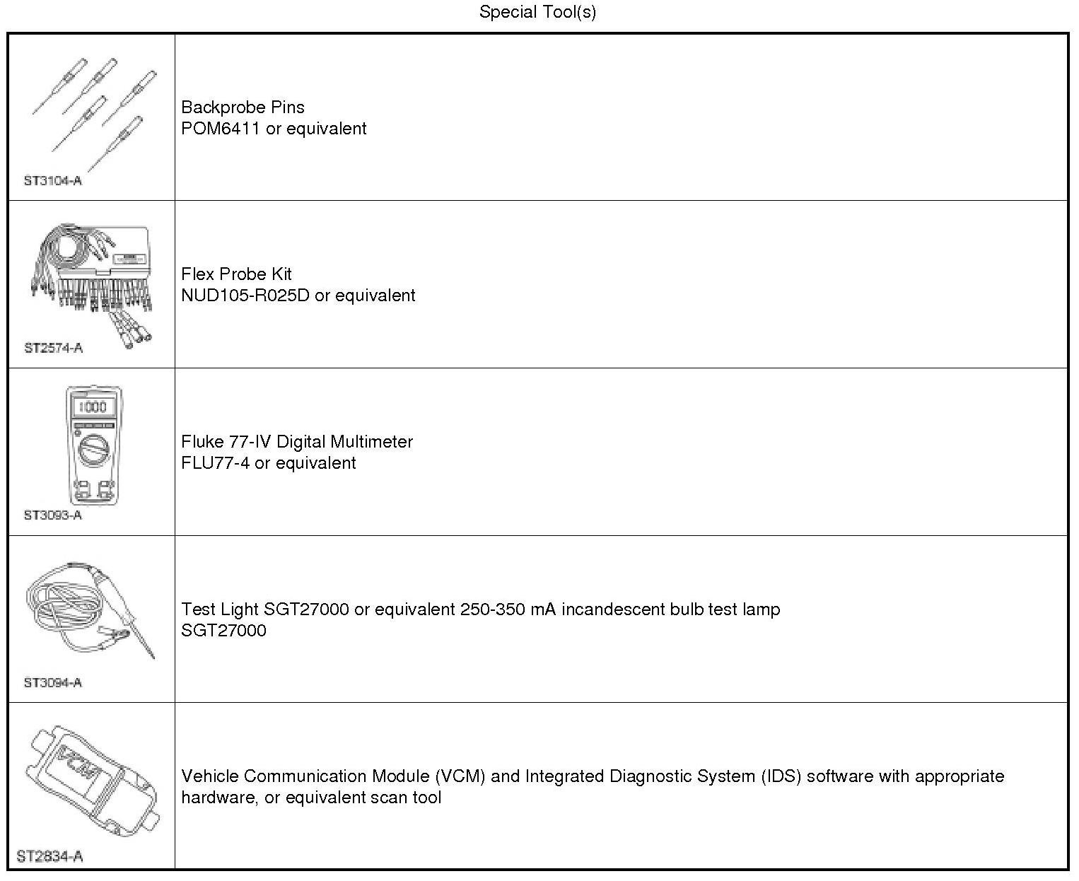 - NOTICE: This pinpoint test step directs testing circuits using a back-probe method. Use the special back-probe tool specified in the tool list. Do not force test leads or other probes into connectors. Adequate care must be exercised to avoid connector terminal damage while making sure that good electrical contact is made with the circuit or terminal. Failure to follow these instructions may cause damage to wiring, terminals or connectors and subsequent electrical faults.