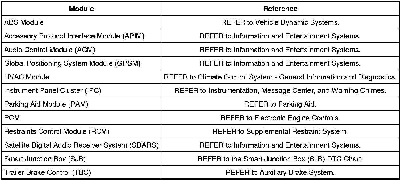 Each module has a comprehensive DTC chart listed in the appropriate information.. Refer to the table below for the appropriate information.
