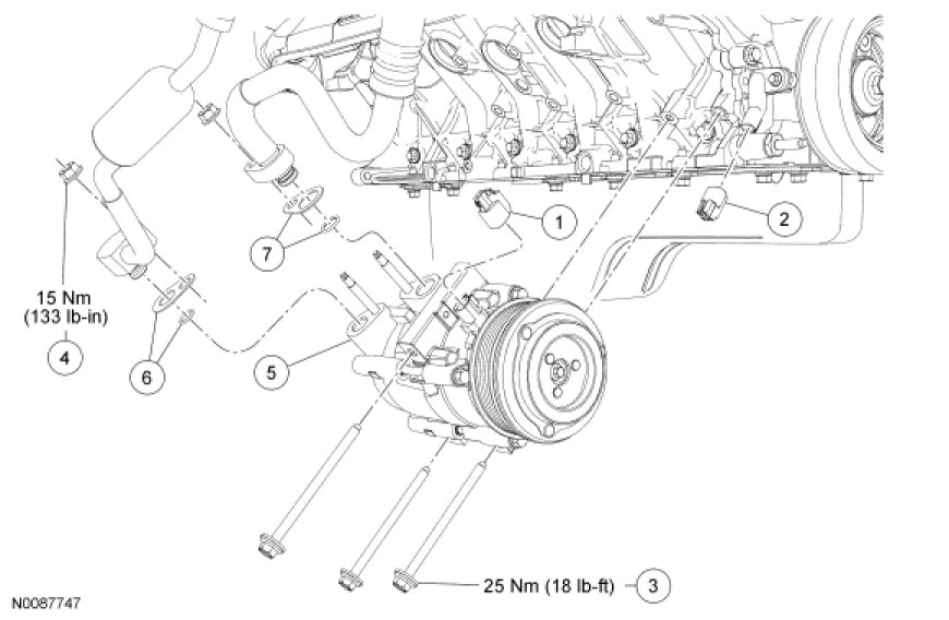 7. Completely loosen the 3 A/C compressor bolts and position the A/C compressor to allow access to the fitting nuts.