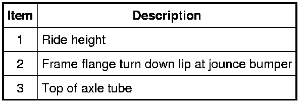 1. Measure the distance between the frame flange turn down lip at the jounce bumper (Item 2) and the top of the axle tube (Item 3) to obtain the ride height (Item 1). For additional information, refer to Specifications.